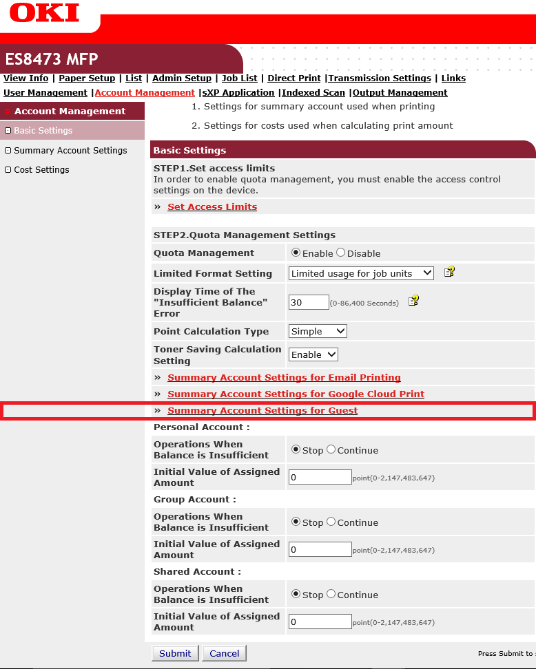 Em seguida acesse "Account Management" e então "Summary Account Settings for Guest".