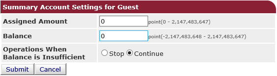 Altere os valores dos dois campos (Assigned Amount e Balance) para 0 (zero), defina Operations When Balance is Insufficient como "Continue" e pressione "Submit".