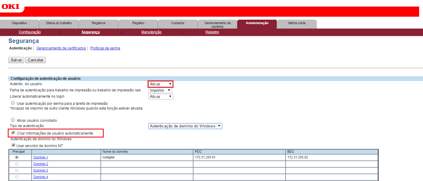 Para configurar autenticação nos equipamentos OKI, acesse a página Web da impressora, digitando o endereço do equipamento no navegador, efetue login com um usuário administrador da impressora e acesse as opções TopAccess->Administration->Security->Authentication