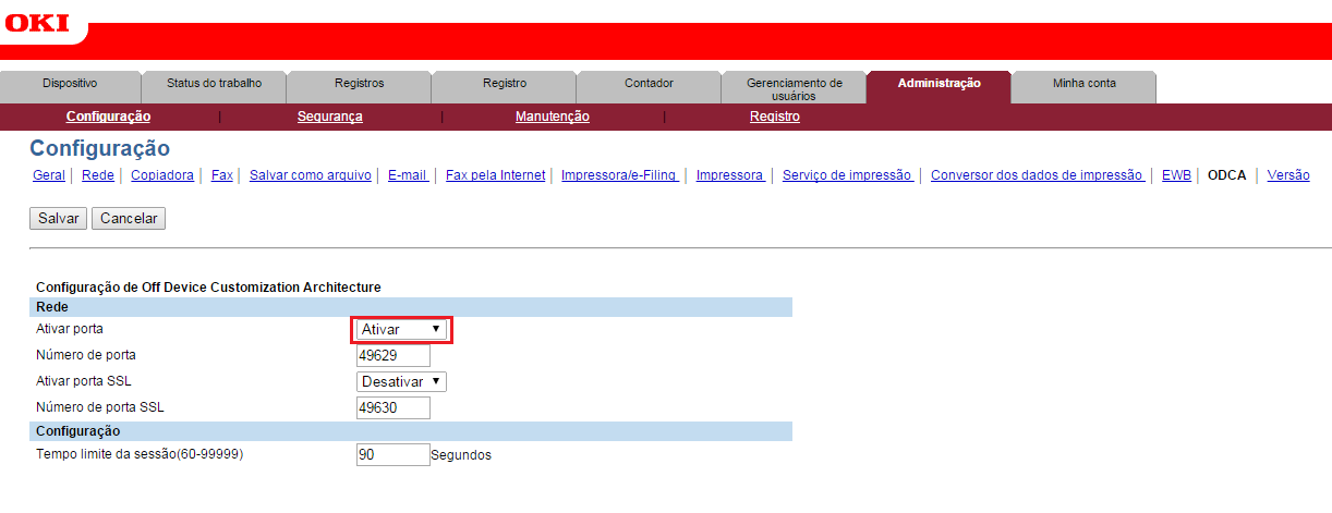 Para ativar e configurar a porta ODCA, acesse a página Web da impressora, digitando o endereço do equipamento no navegador, efetue login com um usuário administrador da impressora e acesse as opções TopAccess->Administration->Setup->ODCA
