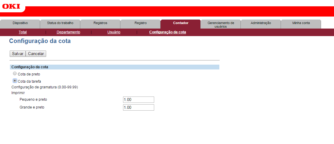 Para configurar os custos, acesse a página Web da impressora, digitando o endereço do equipamento no navegador, efetue login com um usuário administrador e acesse as opções TopAccess > Counter > Quota Setting