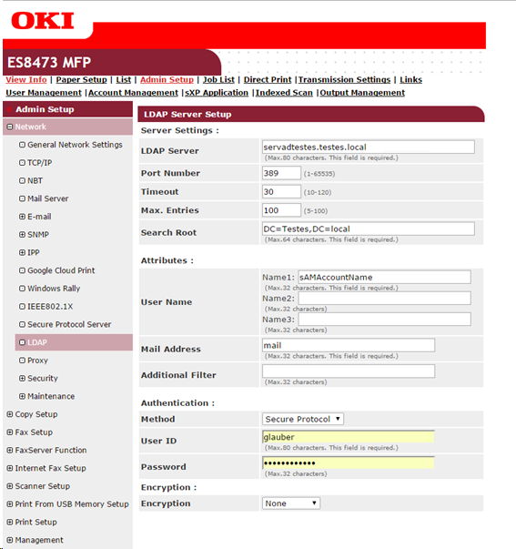 Para configurar a autenticação da impressora em um domínio, acessa-se o menu Admin Setup > Network > LDAP, onde preenche-se os dados referentes ao domínio a ser utilizado.