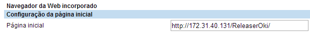 No sub menu Navegador da Web Incorporado, o campo Página inicial deverá ser configurado para que a aplicação fique em primeiro plano na interface inicial, onde o caminho web service do servidor nddPrint Releaser deverá ser inserido. Ex: http://IP_servirdor/ReleaserOKI/. Após, clicar em Salvar para finalizar.