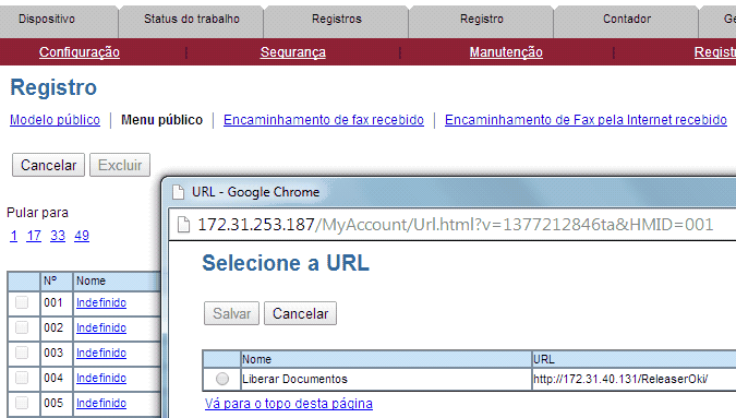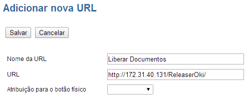 No sub menu “Lista de URLs para a tela do menu e o botão físico”, a aplicação deverá ser cadastrada para que fique listada nos menus da impressora. Para isto, ao clicar em Adicionar, deve-se preencher os campos Nome da URL (nome da aplicação que será visualizado na interface do equipamento), e URL (endereço do servidor). No final, clica-se em Salvar para finalizar.