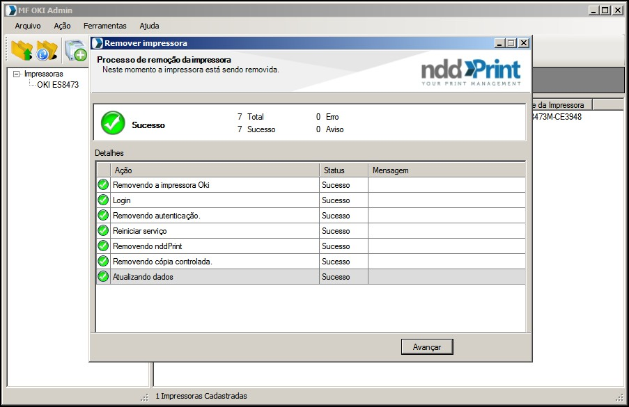 Para efetuar a remoção da solução embarcadas da impressora, é necessário abrir a interface de administração do nddPrint MF OKI, selecionar a impressora desejada e iniciar o assistente de remoção de impressora da mesma.