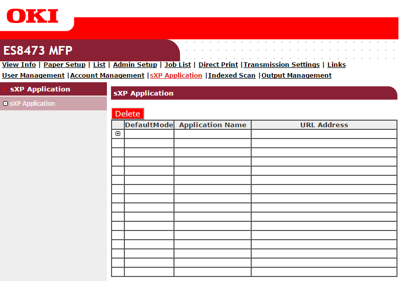 Para efetuar a remoção das configurações do Releaser da impressora, efetua-se o login como administrador na interface web do equipamento, acessando o e acessar o link sXP Application, em seguida selecionar o aplicativo a ser removido e clicar em Delete.
