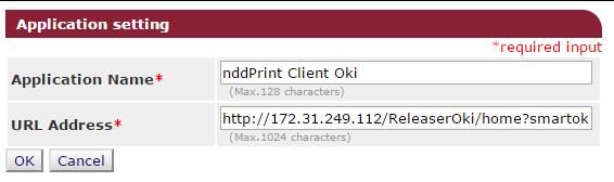 Ao clicar no +, é aberto uma nova página onde tem que ser inserido o nome para aplicação nddPrint Client OKI e o endereço IP do servidor o qual foi instalado o setup do nddPrint Client OKI, Ex: http://IP_servirdor/ReleaserOKI/. Após, clicar em Ok para finalizar.