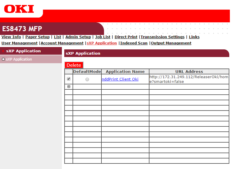 Após a instalação do setup (nddPrintMFOKISetup) no servidor e o cadastramento da impressora no nddPrint Releaser servidor, é necessário efetuar a instalação e configuração do Client (Releaser) embarcado em impressoras com tecnologia sXP Application, efetua-se o login como administrador na interface web do equipamento, e acessar o link sXP Application, e em seguida, clicar em +, que fica localizado na tabela.