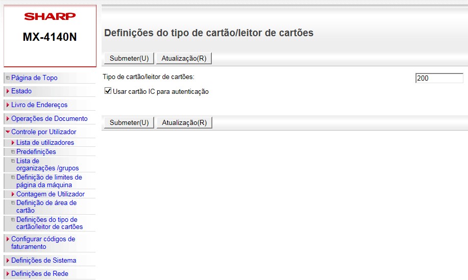 1. Na página web do equipamento, autentique-se como administrador e no caminho "Controle por Utilizador" > "Definições do tipo de cartão/leitor de cartões", marque o campo "Usar cartão IC para autenticação";