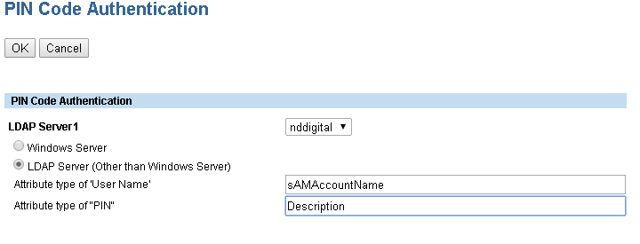 Após ativar, clique no servidor configurado para o funcionamento entre o Active Directory e a impressora e preencha os campos conforme utilizado no ambiente, sendo que neste caso utilizamos: Attribute type of 'User Name': sAMAccountName para mostrar o login do usuário na tela da impressora, e Attribute type of "PIN": Description, que é o atributo das propriedades do usuário utilizado para login no Active Directory.