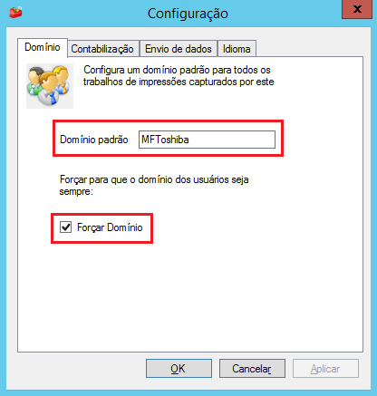Por padrão, é criado um domínio chamado MF Toshiba, para o qual todos os trabalhos serão contabilizados. Na visão Domínio, digite o domínio desejado no campo Domínio padrão. Os trabalhos enviados de impressoras sem domínio configurado serão contabilizados para este domínio.