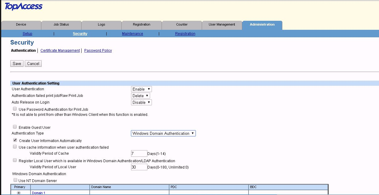 Para configurar a autenticação nos equipamentos Toshiba, acesse a página Web da impressora digitando o IP do equipamento no navegador, efetue login com um usuário administrador da impressora e selecione as opções TopAccess->Administration->Security->Authentication.