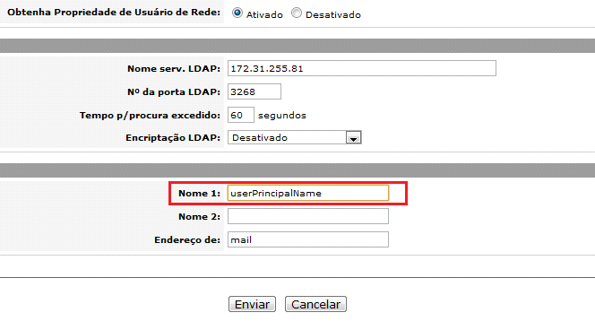 Exemplo de configuração por Active Directory no modelo TaskAlfa 520i. Neste exemplo utilizamos a propriedade userPrincipalName para buscar a informação do login do usuário.