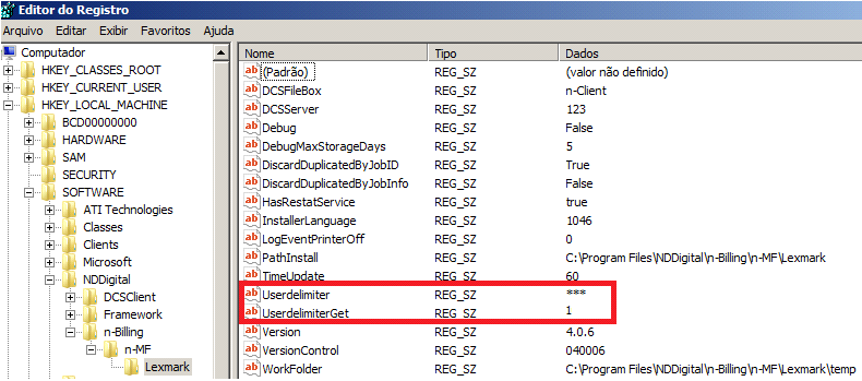 As impressões realizadas na maioria dos softwares do tipo ERP são enviadas para a impressora com um usuário padrão (sem diferenciação entre usuários), porém, estes softwares oferecem a opção para que o nome do usuário seja enviado junto ao título do documento. Para auxiliar na contabilização destes documentos, poderá ser realizada uma configuração no registro do Windows, que permite que o n-MF identifique o usuário correto para a contabilização, utilizando o título do documento. Para utilizar esta característica, abra o registro do Windows siga até o caminho: HKEY_LOCAL_MACHINE\SOFTWARE\NDDigital\n-Billing\n-MF\Lexmark. Dentro deste local deverão ser criados os valores de sequência: