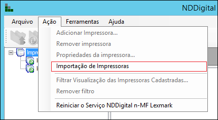 Para tal, acesse a interface de administração do n-MF Lexmark, Ação e então selecione Importação de Impressoras.