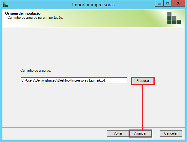 Na tela inicial do assistente, selecione Avançar para prosseguir com a importação. Em seguida, selecione o arquivo que contém os dados das impressoras a serem importadas.