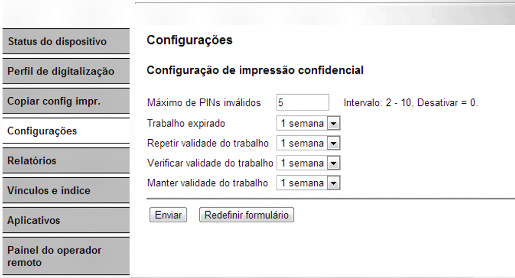 Na interface web do equipamento também deve ser ativada esta funcionalidade, acessando o endereço IP do equipamento pelo navegador e seguindo as opções Configurações> Segurança> Configuração de impressão confidencial, e habilitando as opções conforme desejado. É importante que o tempo configurado seja igual ao n-MF Lexmark, na aba “Impressão confidencial”.