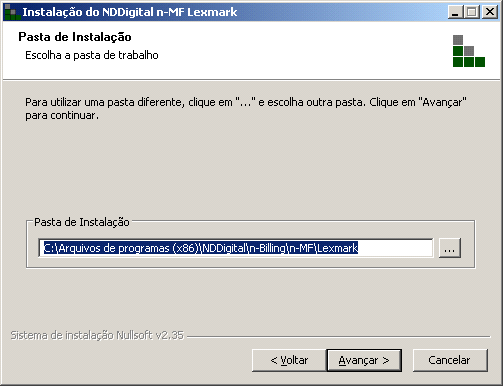 Na próxima interface, deverá ser escolhido o diretório de instalação do n-MF. Para alterar o diretório sugerido, basta clicar em “...”, escolher o local desejado e em seguida Avançar.