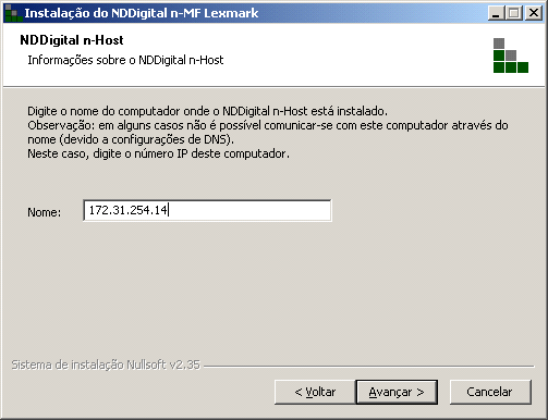 Caso esteja instalado no mesmo computador onde a instalação do n-MF será realizada, essa janela não será exibida, pois, o instalador identifica automaticamente o NDD Print Host.