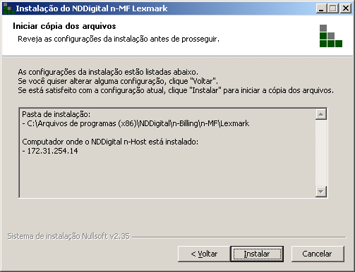 Esta interface exibe o resumo da instalação, neste ponto ainda é possível voltar e efetuar as alterações desejadas, para isso clique em Voltar. Se estiver de acordo com as configurações clique em Instalar para para iniciar a cópia dos arquivos.