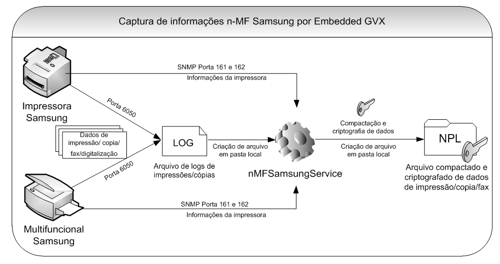 Nos equipamentos que possuem a solução NDDigital Collector Embedded Samsung GVX instalada, quando um trabalho é realizado no equipamento, a solução embarcada salva as informações dos trabalhos dentro do próprio equipamento. A cada 30 minutos é efetuado download do arquivo da impressora e os dados são salvos em um arquivo .log. Quando ocorre o time update (intervalo de tempo configurado na interface) é gerado um arquivo criptografado com extensão NPL, com todas as informações de contabilização.