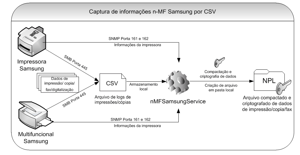 Nos equipamentos monitorados pelo SyncThru, as informações dos trabalhos realizados nos equipamentos Samsung são salvos no banco de dados do SyncThru. Quando ocorre o time update (intervalo de tempo configurado na interface) é verificado se existe algum dado de contabilização no banco de dados do SyncThru, se houver, estes dados são convertidos para um arquivo criptografado com extensão NPL.