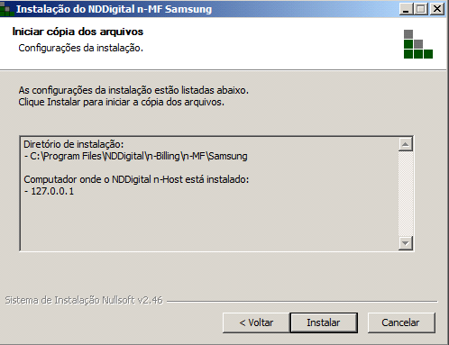 Será exibido um resumo das configurações realizadas. Clique em Instalar para iniciar a cópia dos arquivos.