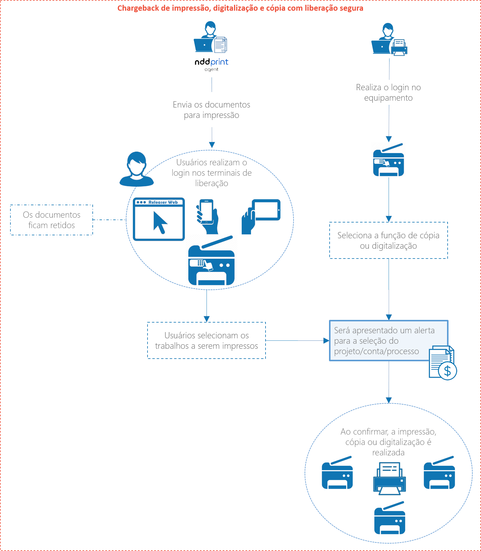 Neste cenário, o NDD Print Agent realiza a interface com os usuários, apresentando um alerta, sempre que um documento é enviado para impressão. Aos administradores, por meio do NDD Print 360 Server, permite realizar o cadastro dos projetos/processos/contas, bem como visualizar os relatórios referentes à funcionalidade.