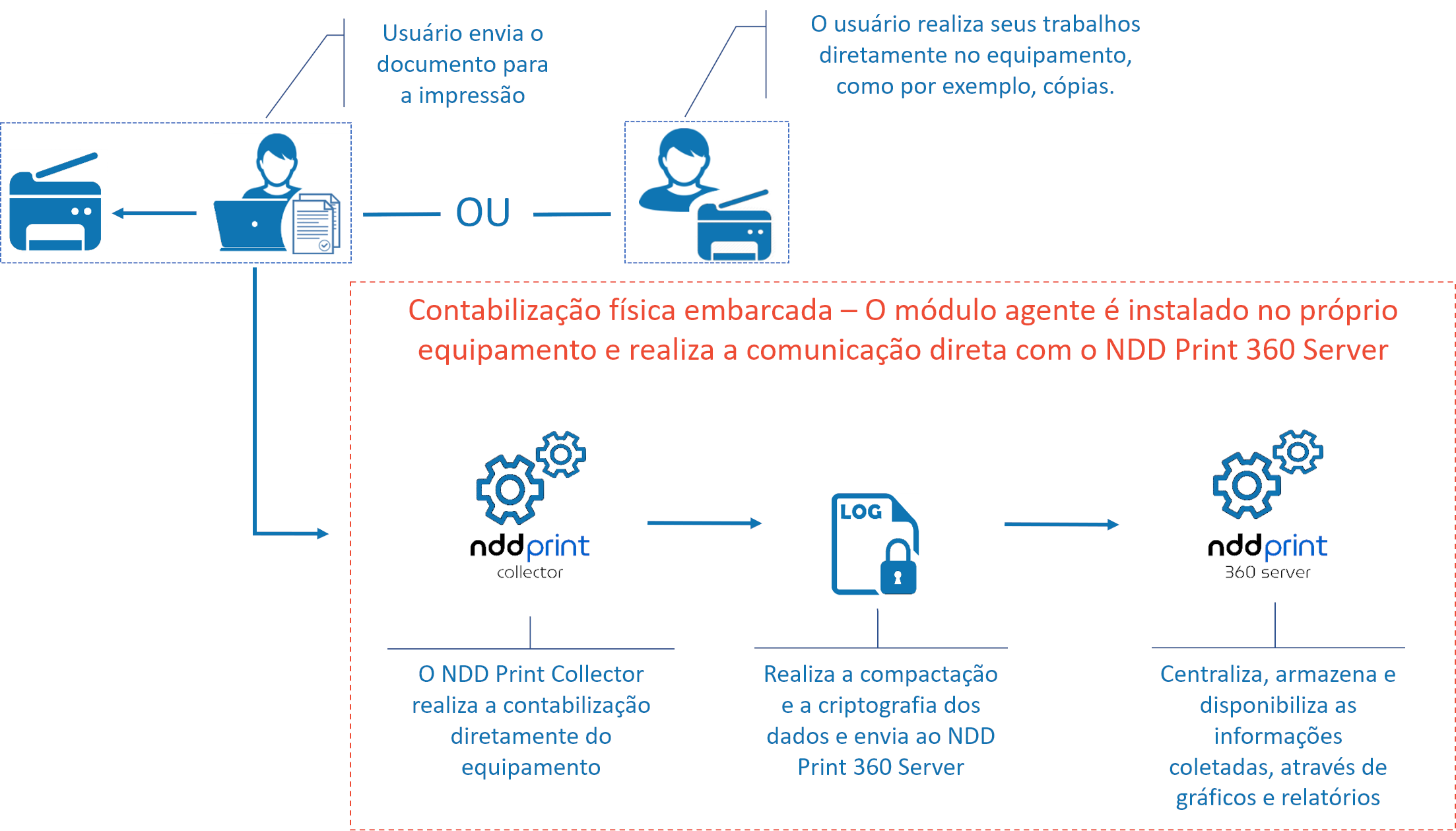 A contabilização física embarcada é realizada pelo módulo NDD Print Collector, que quando instalado nos equipamentos, realiza a contabilização de todos os trabalhos de impressão, digitalização, cópia e fax, diretamente no equipamento.