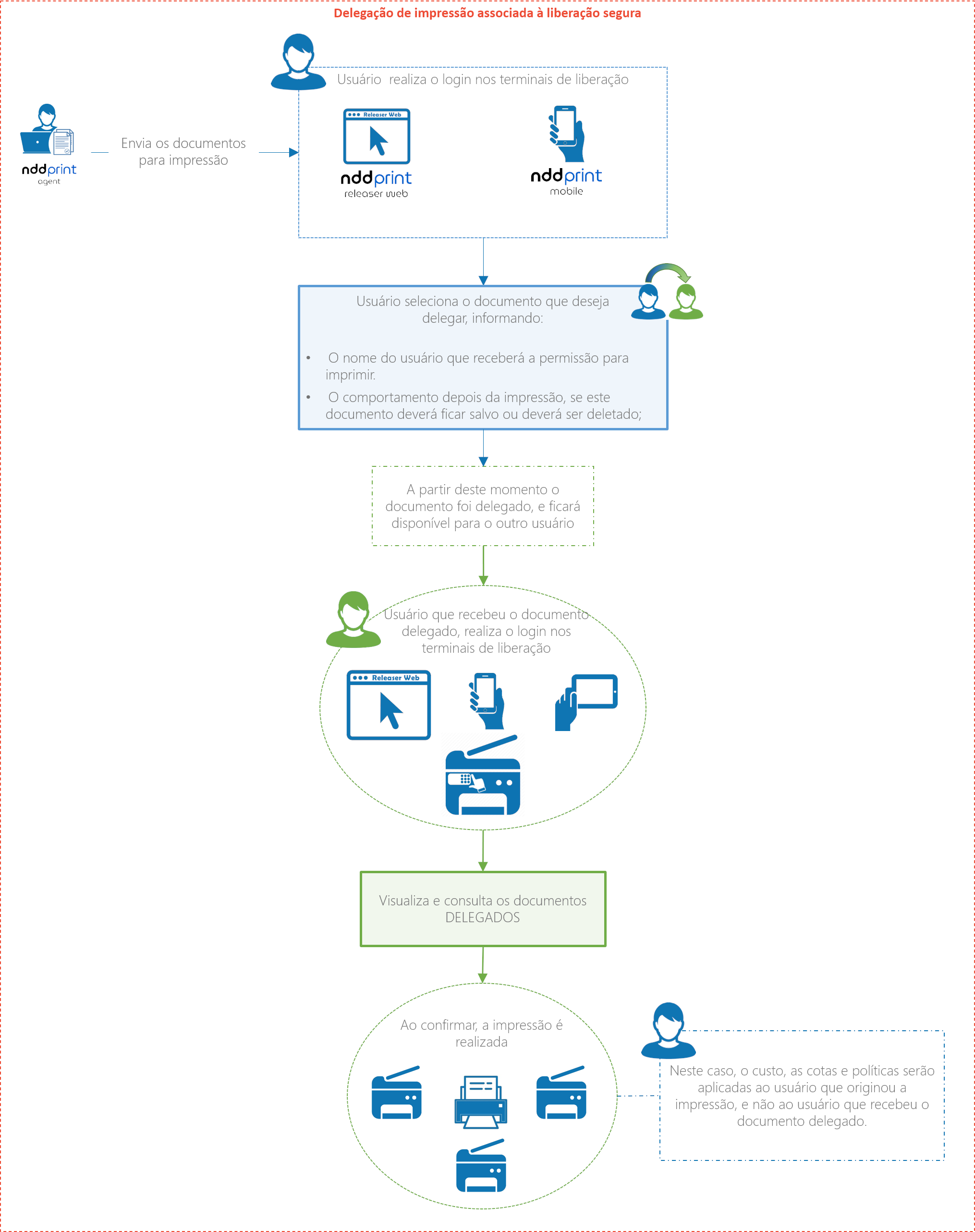 Esta funcionalidade permite aos usuários delegarem uma impressão à outra pessoa, permitindo assim, que esta outra pessoa, libere o documento mediante login nos terminais de liberação (liberação segura). Observe que neste caso o usuário que imprime não é o mesmo que retira a impressão no equipamento.