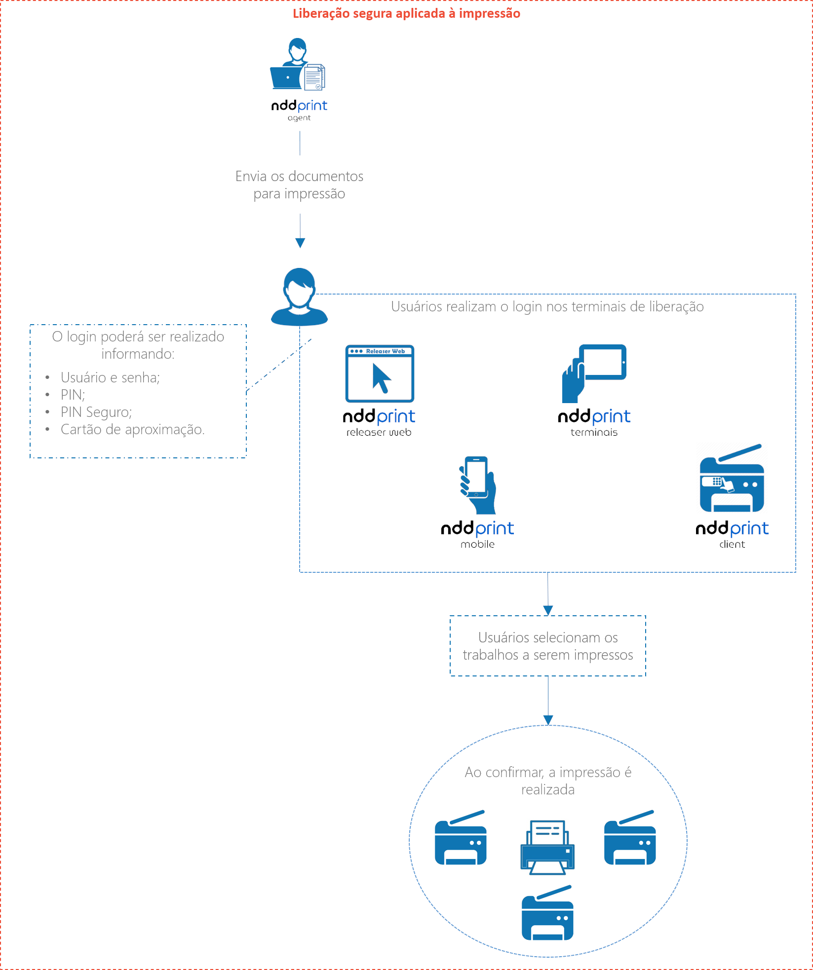 Neste cenário, os usuários enviam os documentos para impressão, e realizam a autenticação nos terminais de liberação para imprimi-los.