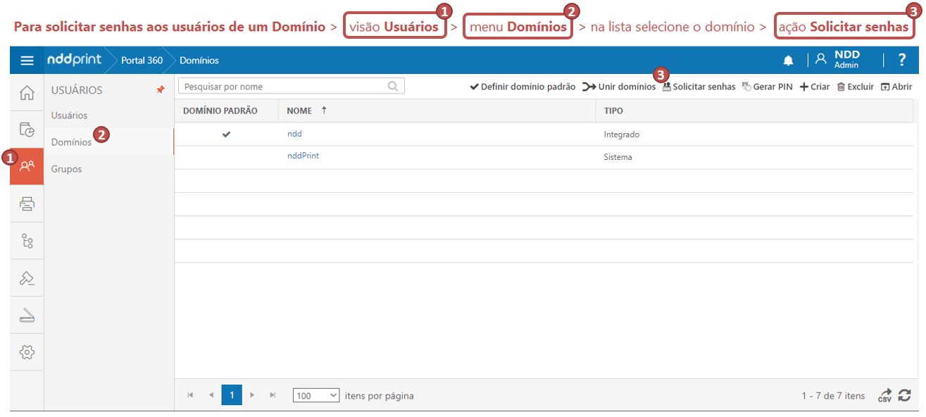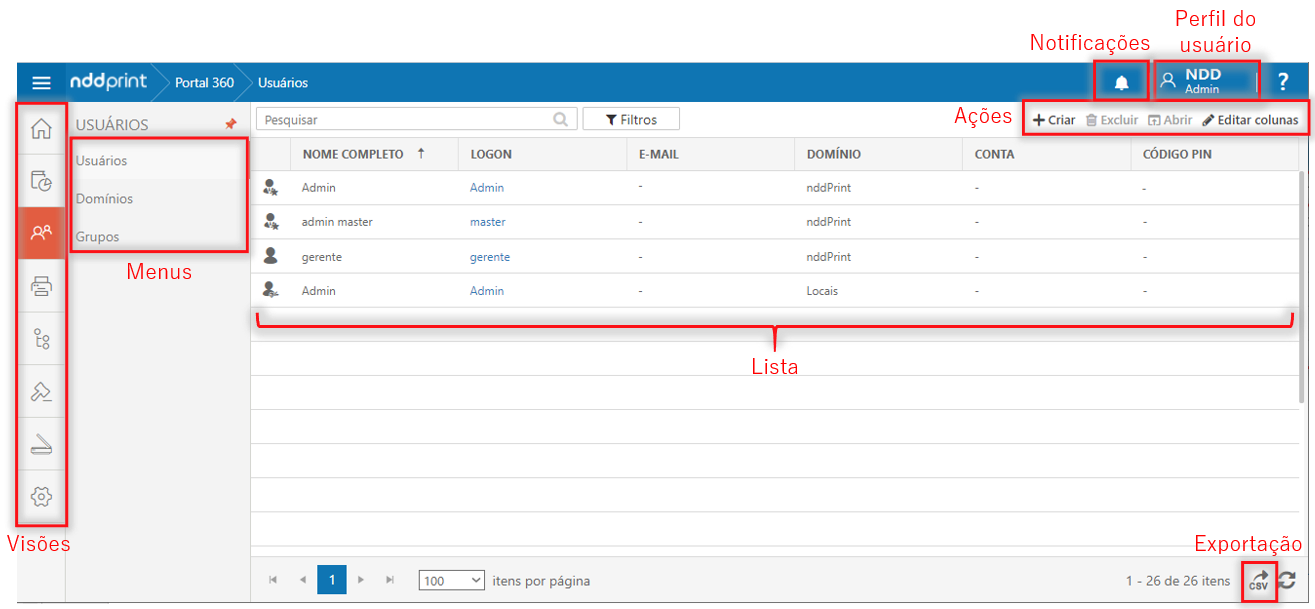 Os passos serão descritos tendo em vista a nomenclatura dos objetos que compõe a tela do NDD Print Portal 360: