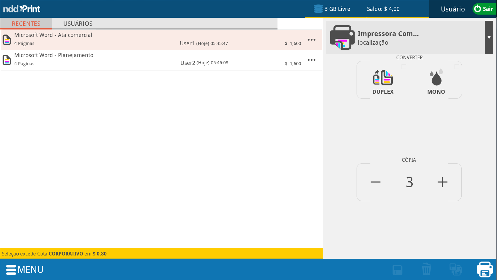 Na interface dos documentos delegados, o usuário interage através dos botões RECENTES (documentos delegados nas últimas 24 horas) e USUÁRIOS (todas as delegações de documentos por usuários), sendo que em ambas as visões o usuário poderá efetuar conversão para Mono e Duplex; visualizar a quantidade de cópias, nome do documento, nome do proprietário, número de páginas, valores (quando ativo), data de envio e impressoras disponíveis.