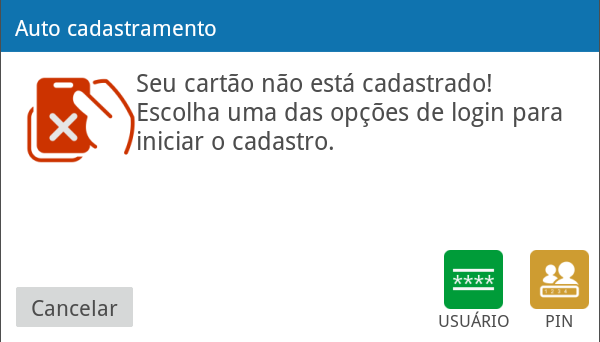 Para cadastrar um cartão, basta aproximá-lo do leitor e escolher a forma de autenticação disponível, sendo que poderá ter cadastro via Usuário/Senha ou PIN.
