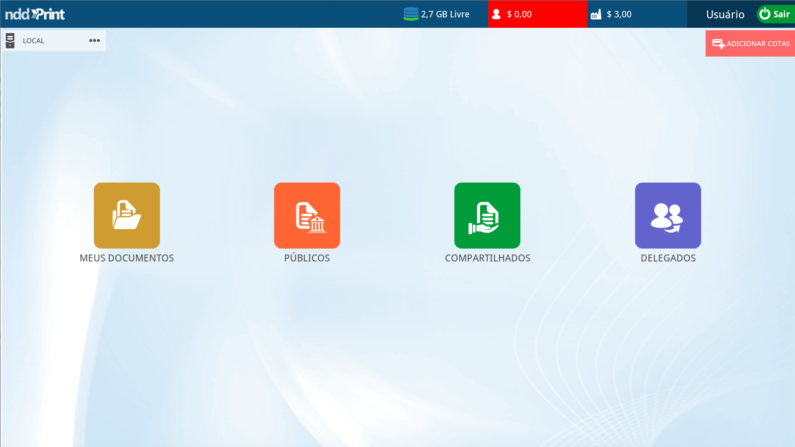 Após logar no sistema será exibida a interface de escolha de tipo de documentos, onde o usuário irá escolher dentre Meus Documentos, Públicos ou Compartilhados, tendo ainda a opção de inserir cotas particulares pré-pagas e visualizar seu saldo.