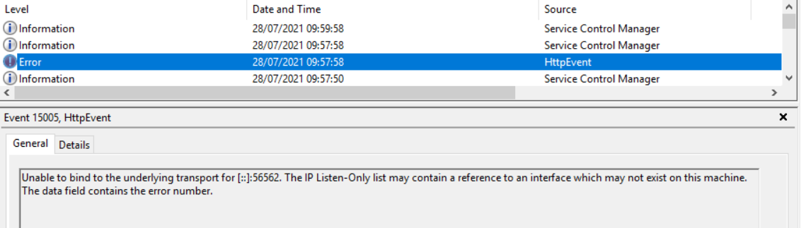 É gerado o evento “Unable to bind to the underlying transport for [::]:56562. The IP Listen-Only list may contain a refence to an interface wich may not exist on the machine. The data field contains the error number.” no Windows.