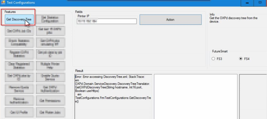 Na ferramenta Test Configutarion, quando tentávamos fazer a chamada “Get discovery tree”, a falha “Error: Error accessing DiscoveryTree.xml: StackTrace: em OXPd: Domain.ServiceDiscovery.DicoveryTreeTranslator.GetOXPdDiscoveryTree(String hostname, int 16 port, Boolean use HTTPS) em TestConfigurations.FrmTestConfigurations.GetDiscoveryTree()”, era apresentada.