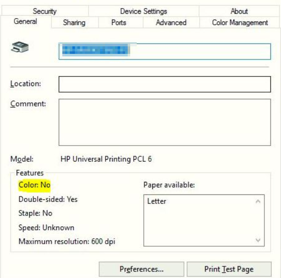 A partir das versões 6 dos driver Universal da HP, realiza uma comunicação com o equipamento afim de buscar as propriedades, se o equipamento é capaz de realizar trabalhos coloridos ou preto branco, por exemplo, como o Grupo de impressão se trata de uma fila virtual, não é possível buscar esse tipo de propriedade.
